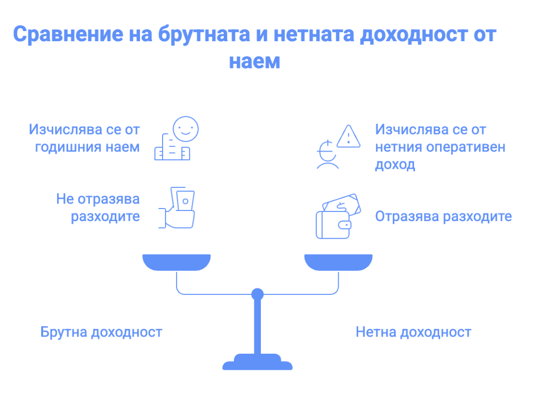 Една от най-честите грешки е използването само на брутната доходност. Тя изглежда по-висока, но не отчита реалните разходи.