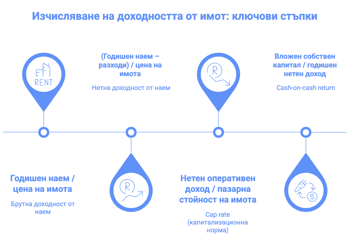 Доходността от имот се изчислява като съотношение между годишния доход от наем и цената на имота. Най-простият показател е брутната доходност, при която се дели годишният наем на цената на имота. За по-точна оценка обаче е важно да се използва нетната доходност, която отчита и разходите за поддръжка, ремонти и периоди без наемател.